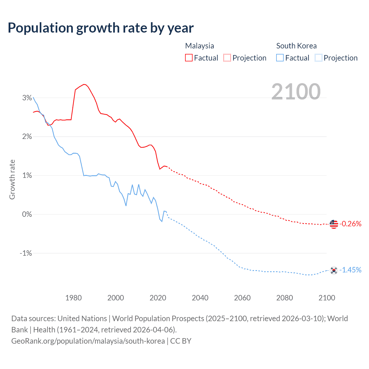 - For the last 10 years, Malaysia has had an average growth rate of +1.5% per year vs +0.24% in South Korea.