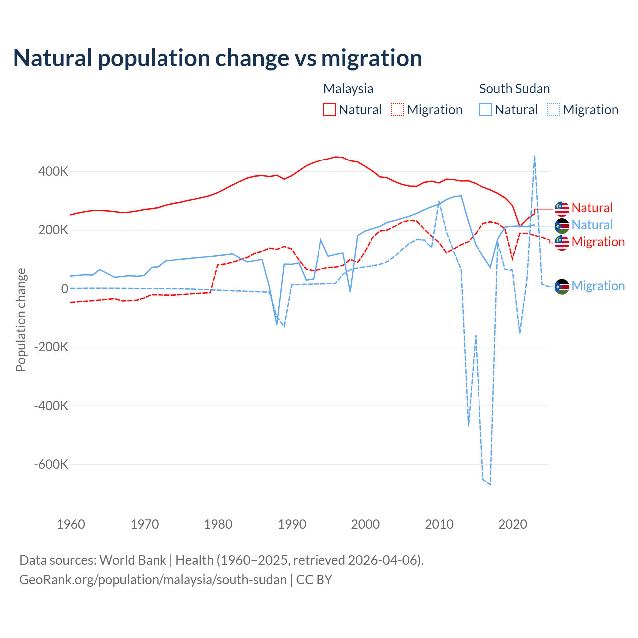 Over the last 10 years, 61.7% of the population change in Malaysia is from natural causes (a gain of 3,029,648 people) and 38.3% is from migration (a gain of 1,882,159 people). In South Sudan 57.4% is from natural causes (a gain of 1,792,135 people) and 42.6% is from migration (a loss of 1,329,606 people).