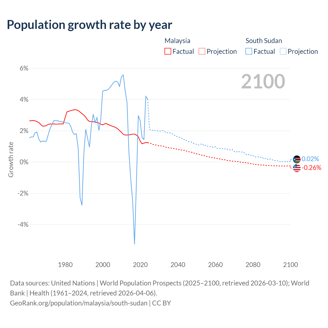 - For the last 10 years, Malaysia has had an average growth rate of +1.5% per year vs +0.65% in South Sudan.