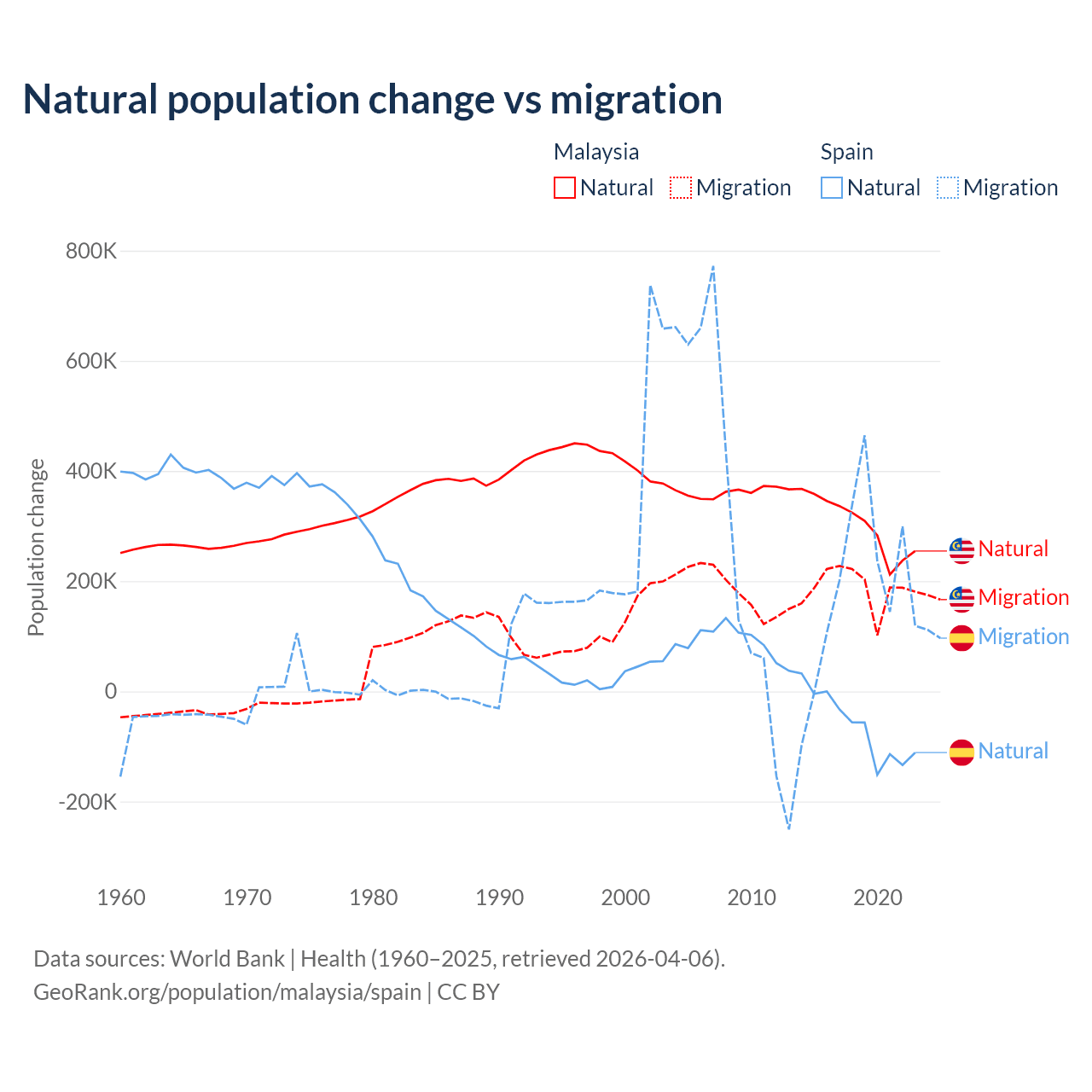 Over the last 10 years, 61.7% of the population change in Malaysia is from natural causes (a gain of 3,029,648 people) and 38.3% is from migration (a gain of 1,882,159 people). In Spain 25.8% is from natural causes (a loss of 627,829 people) and 74.2% is from migration (a gain of 1,810,127 people).