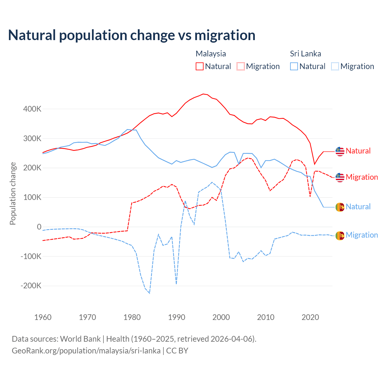 Over the last 10 years, 61.7% of the population change in Malaysia is from natural causes (a gain of 3,029,648 people) and 38.3% is from migration (a gain of 1,882,159 people). In Sri Lanka 85.3% is from natural causes (a gain of 1,605,749 people) and 14.7% is from migration (a loss of 276,121 people).