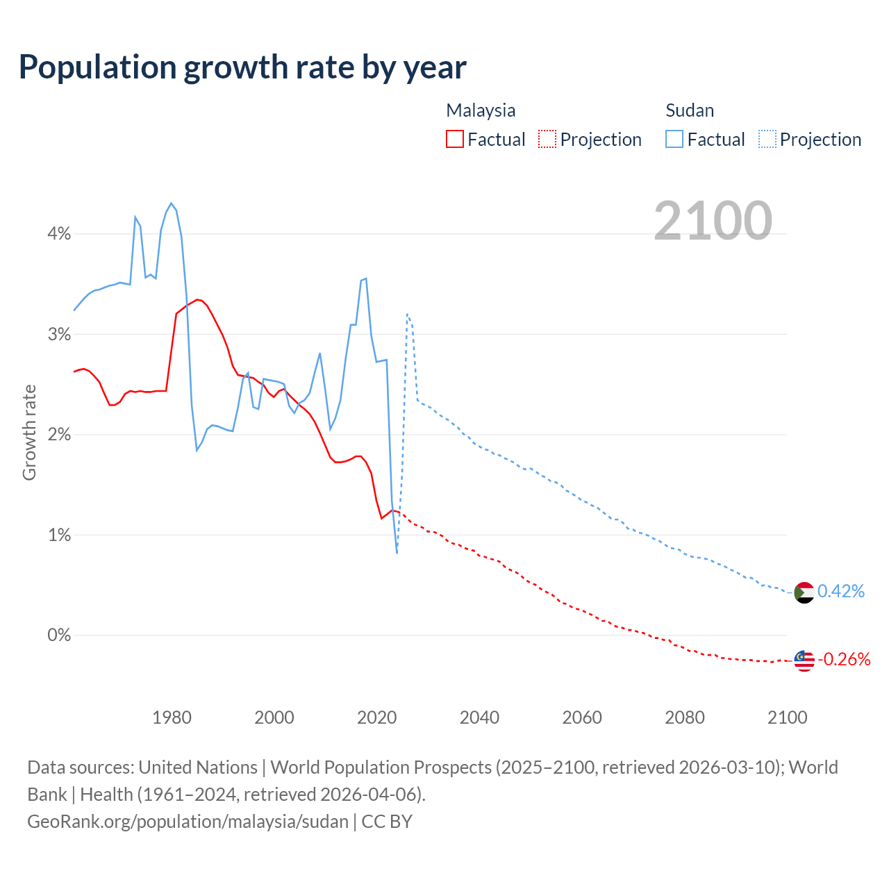 Data sources: World Bank | Health (1960–2024, retrieved 2026-04-06); United Nations | World Population Prospects (1960–2026, retrieved 2026-03-10); U.S. Census Bureau (1960–2025, retrieved 2026-02-08); Central Intelligence Agency (CIA) (2000–2019, retrieved 2026-02-20).
