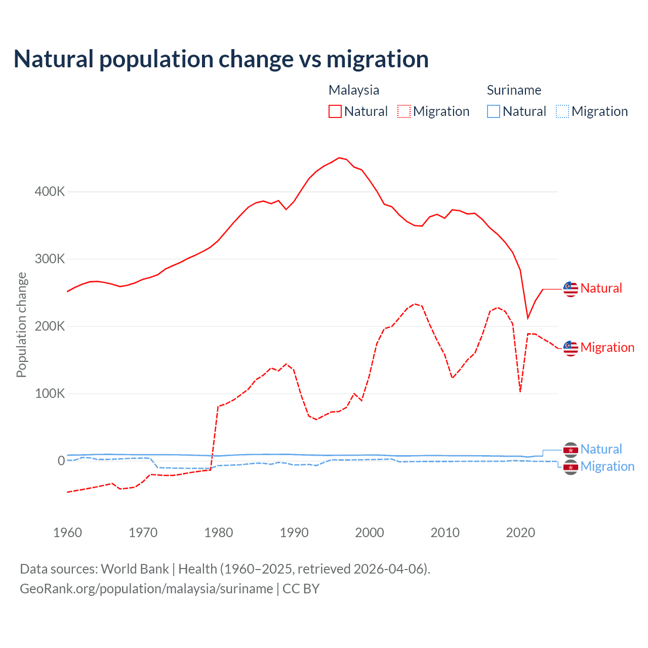 Over the last 10 years, 61.7% of the population change in Malaysia is from natural causes (a gain of 3,029,648 people) and 38.3% is from migration (a gain of 1,882,159 people). In Suriname 90.3% is from natural causes (a gain of 66,709 people) and 9.72% is from migration (a loss of 7,185 people).