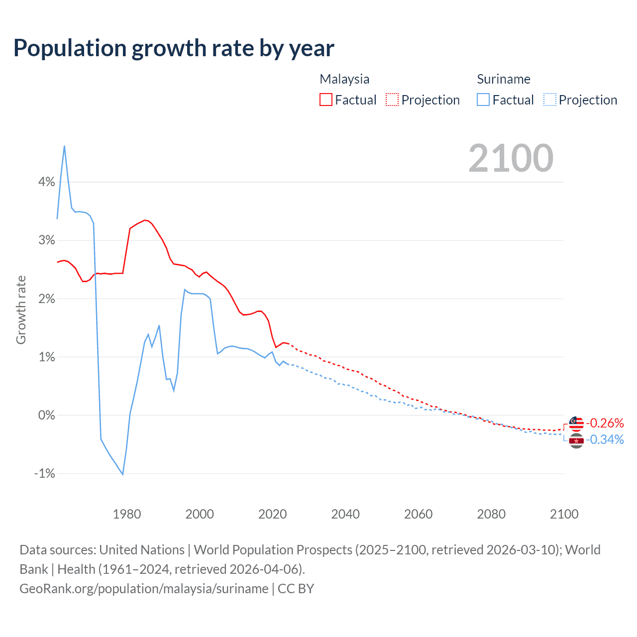 - For the last 10 years, Malaysia has had an average growth rate of +1.5% per year vs +0.99% in Suriname.