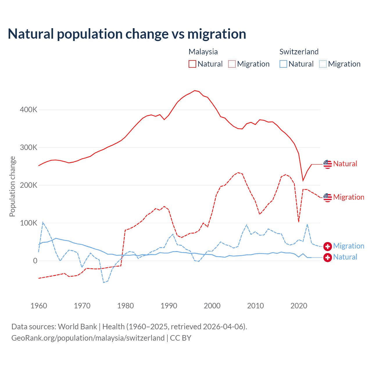 Over the last 10 years, 61.7% of the population change in Malaysia is from natural causes (a gain of 3,029,648 people) and 38.3% is from migration (a gain of 1,882,159 people). In Switzerland 21.6% is from natural causes (a gain of 165,354 people) and 78.4% is from migration (a gain of 600,145 people).