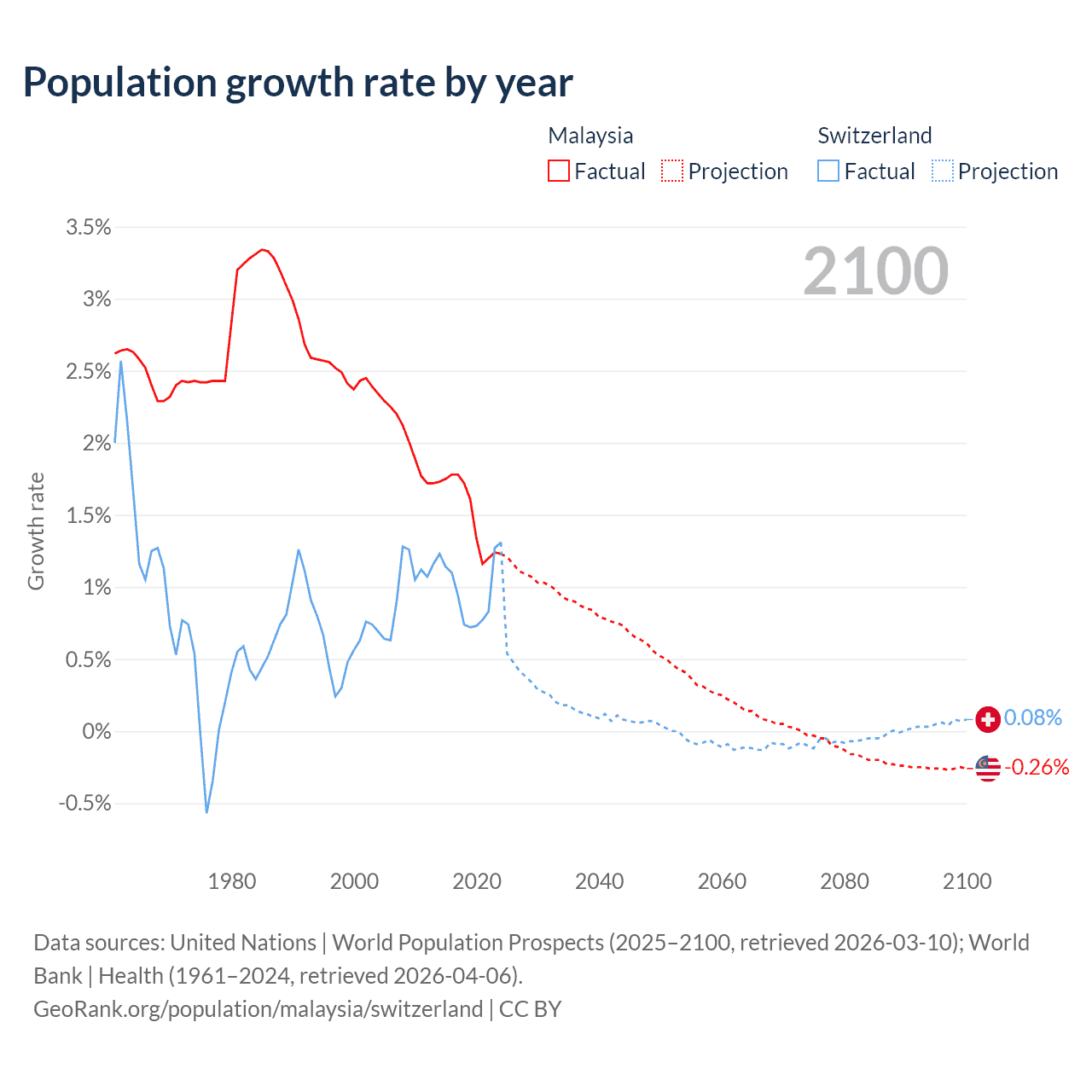 - For the last 10 years, Malaysia has had an average growth rate of +1.5% per year vs +0.98% in Switzerland.