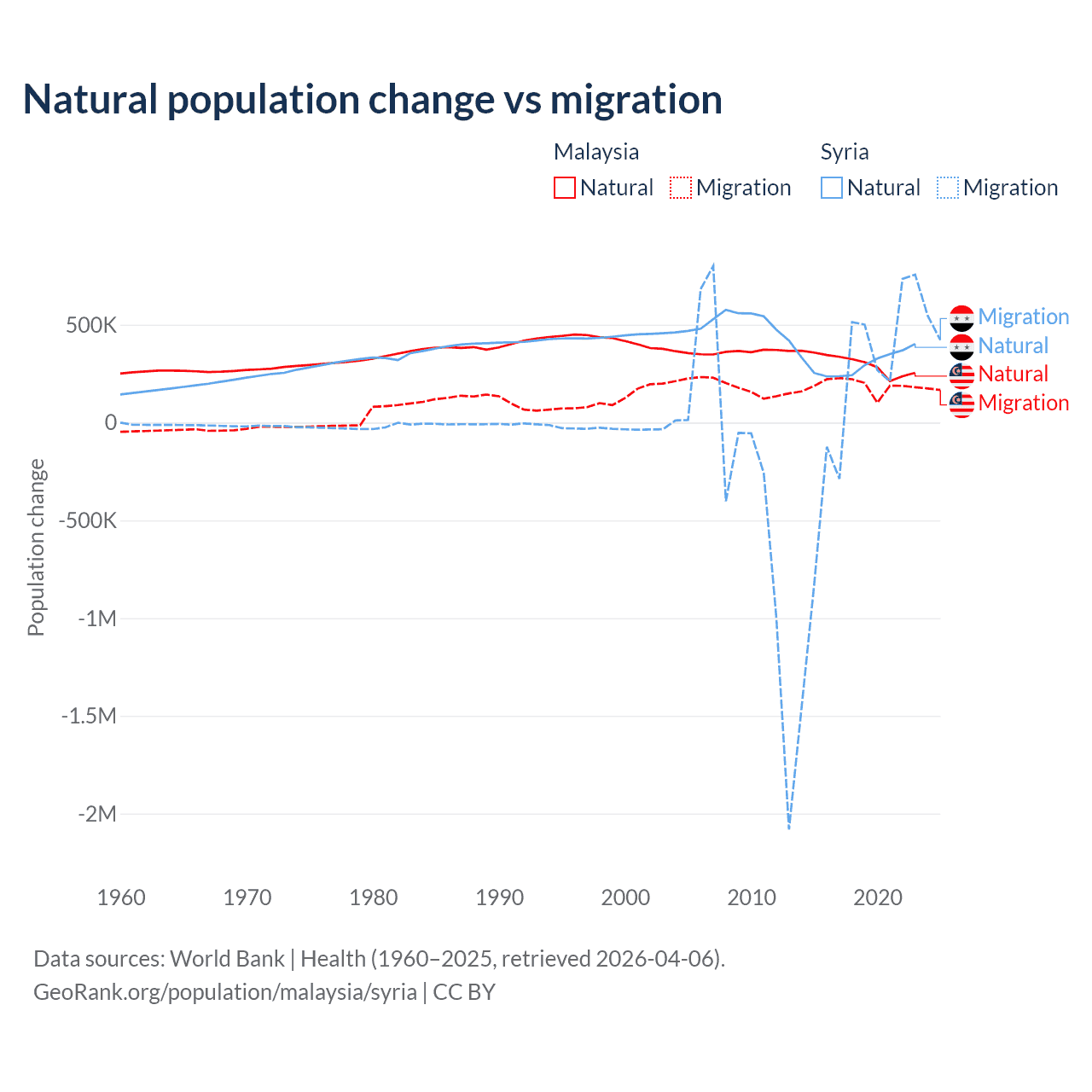 Over the last 10 years, 61.7% of the population change in Malaysia is from natural causes (a gain of 3,029,648 people) and 38.3% is from migration (a gain of 1,882,159 people). In Syria 91.3% is from natural causes (a gain of 3,047,621 people) and 8.72% is from migration (a gain of 291,069 people).