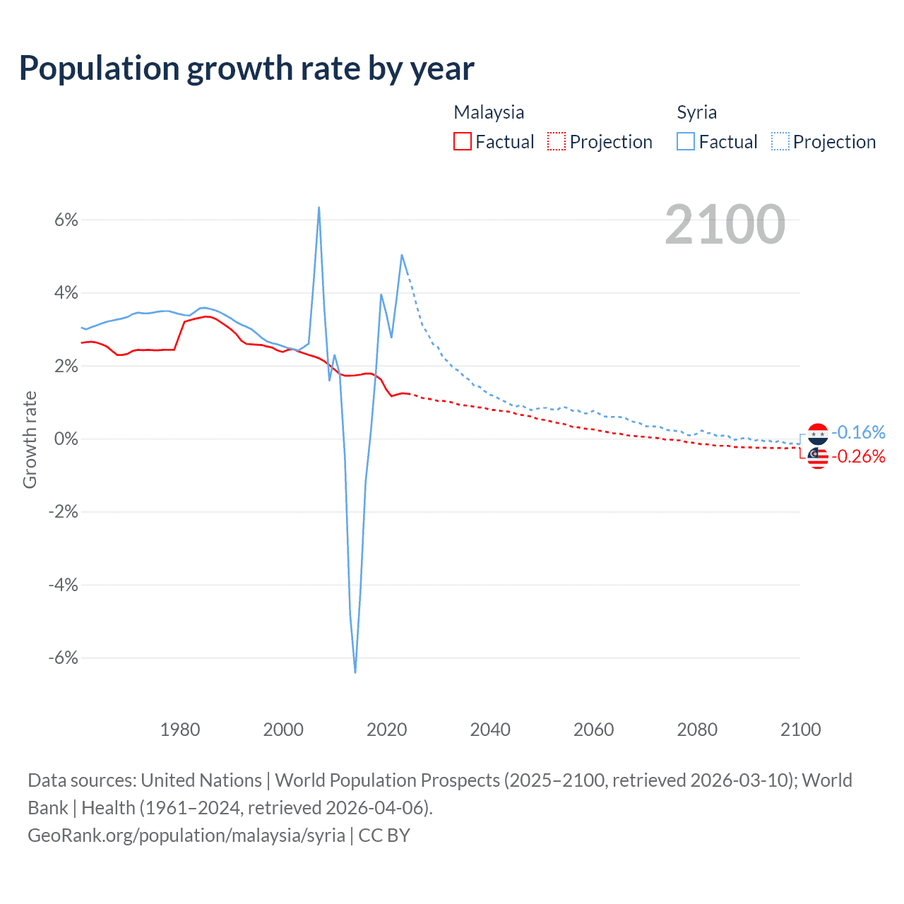 - For the last 10 years, Malaysia has had an average growth rate of +1.5% per year vs +1.25% in Syria.