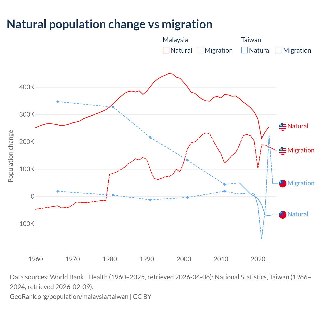 Over the last 10 years, 61.7% of the population change in Malaysia is from natural causes (a gain of 3,029,648 people) and 38.3% is from migration (a gain of 1,882,159 people). In Taiwan 56.7% is from natural causes (a loss of 57,467 people) and 43.3% is from migration (a gain of 43,884 people).