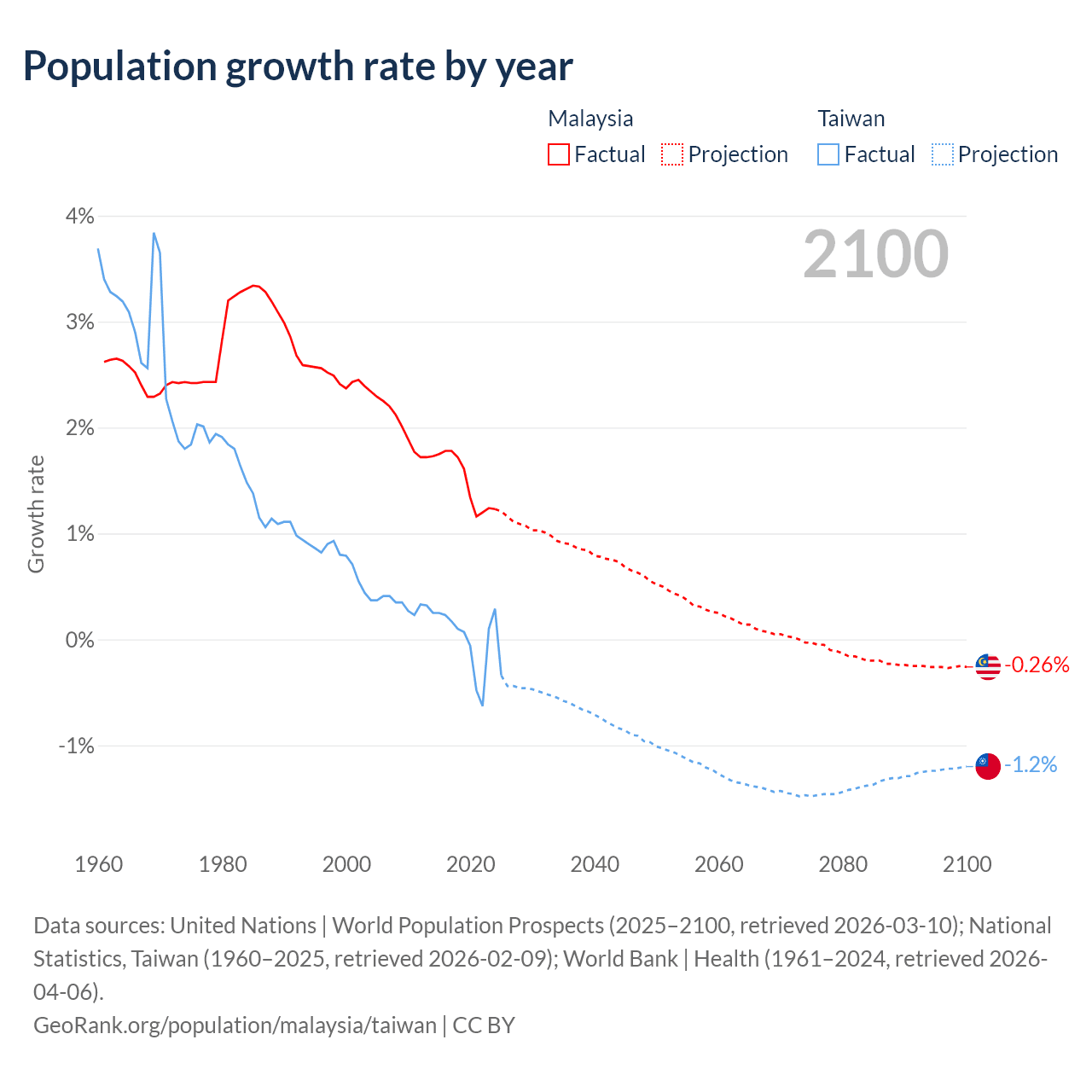 - For the last 10 years, Malaysia has had an average growth rate of +1.5% per year vs -0.03% in Taiwan.