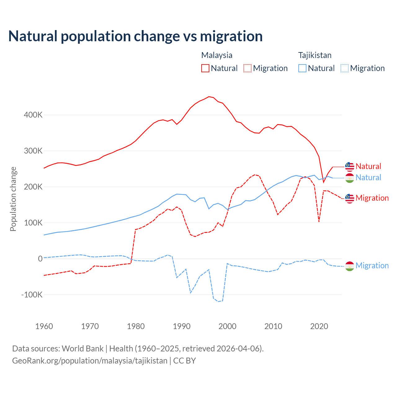 Over the last 10 years, 61.7% of the population change in Malaysia is from natural causes (a gain of 3,029,648 people) and 38.3% is from migration (a gain of 1,882,159 people). In Tajikistan 96% is from natural causes (a gain of 2,266,045 people) and 3.95% is from migration (a loss of 93,205 people).