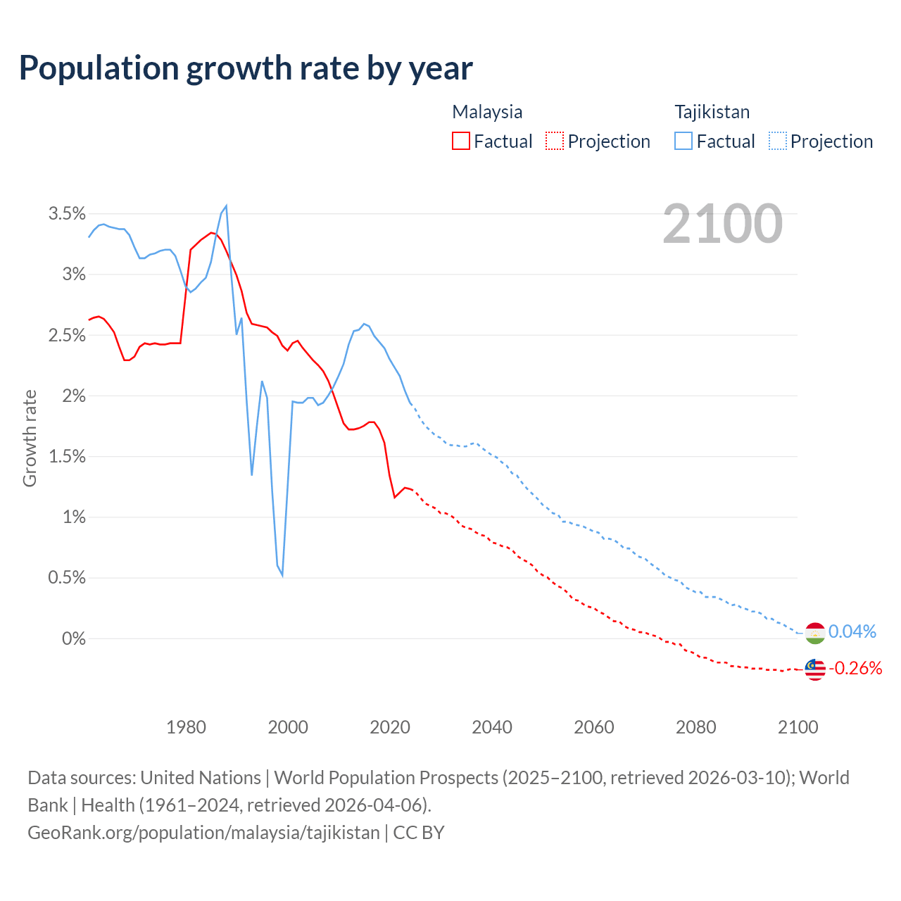 Data sources: World Bank | Health (1960–2024, retrieved 2026-04-06); United Nations | World Population Prospects (1960–2026, retrieved 2026-03-10); U.S. Census Bureau (1960–2025, retrieved 2026-02-08); Central Intelligence Agency (CIA) (2000–2019, retrieved 2026-02-20).