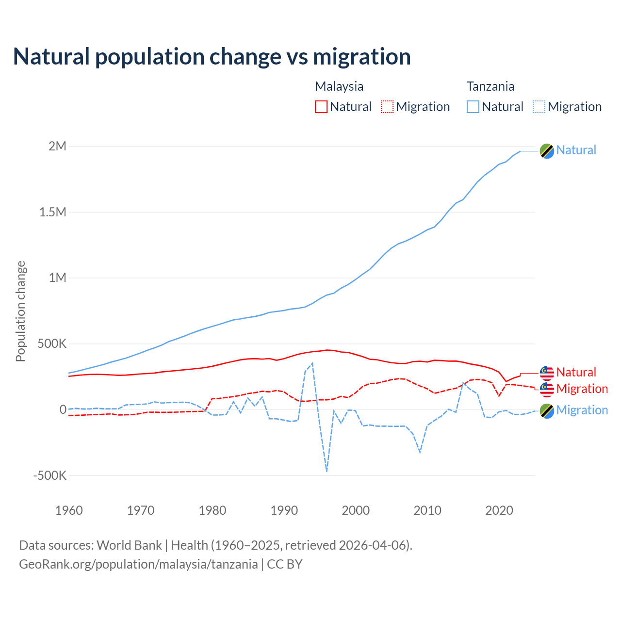 Over the last 10 years, 61.7% of the population change in Malaysia is from natural causes (a gain of 3,029,648 people) and 38.3% is from migration (a gain of 1,882,159 people). In Tanzania 98.7% is from natural causes (a gain of 17,769,541 people) and 1.27% is from migration (a gain of 229,466 people).