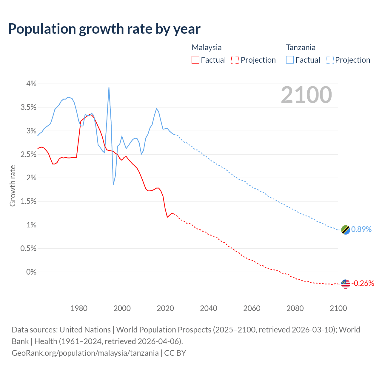 - For the last 10 years, Malaysia has had an average growth rate of +1.5% per year vs +3.13% in Tanzania.