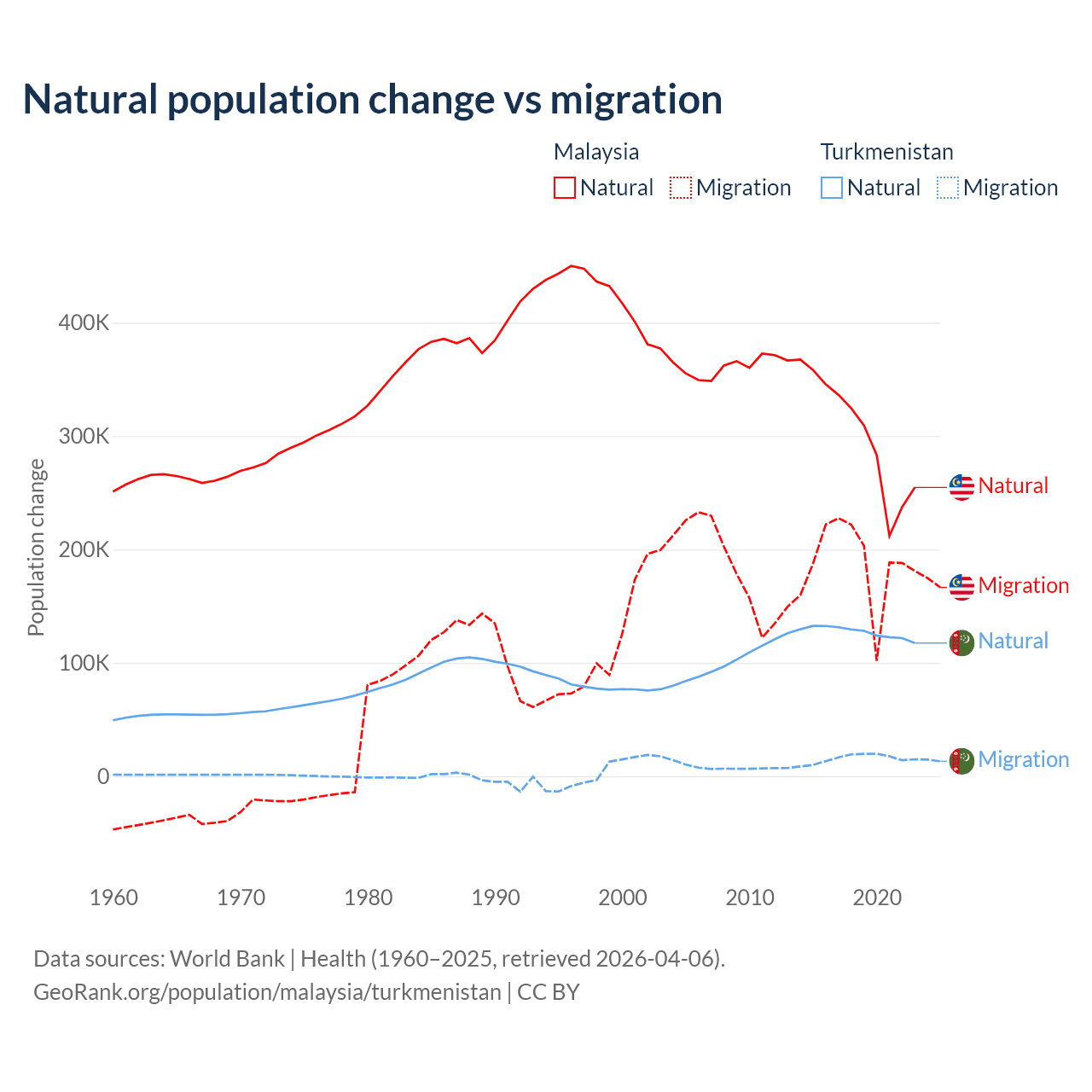 Over the last 10 years, 61.7% of the population change in Malaysia is from natural causes (a gain of 3,029,648 people) and 38.3% is from migration (a gain of 1,882,159 people). In Turkmenistan 89.2% is from natural causes (a gain of 1,270,228 people) and 10.8% is from migration (a gain of 154,379 people).