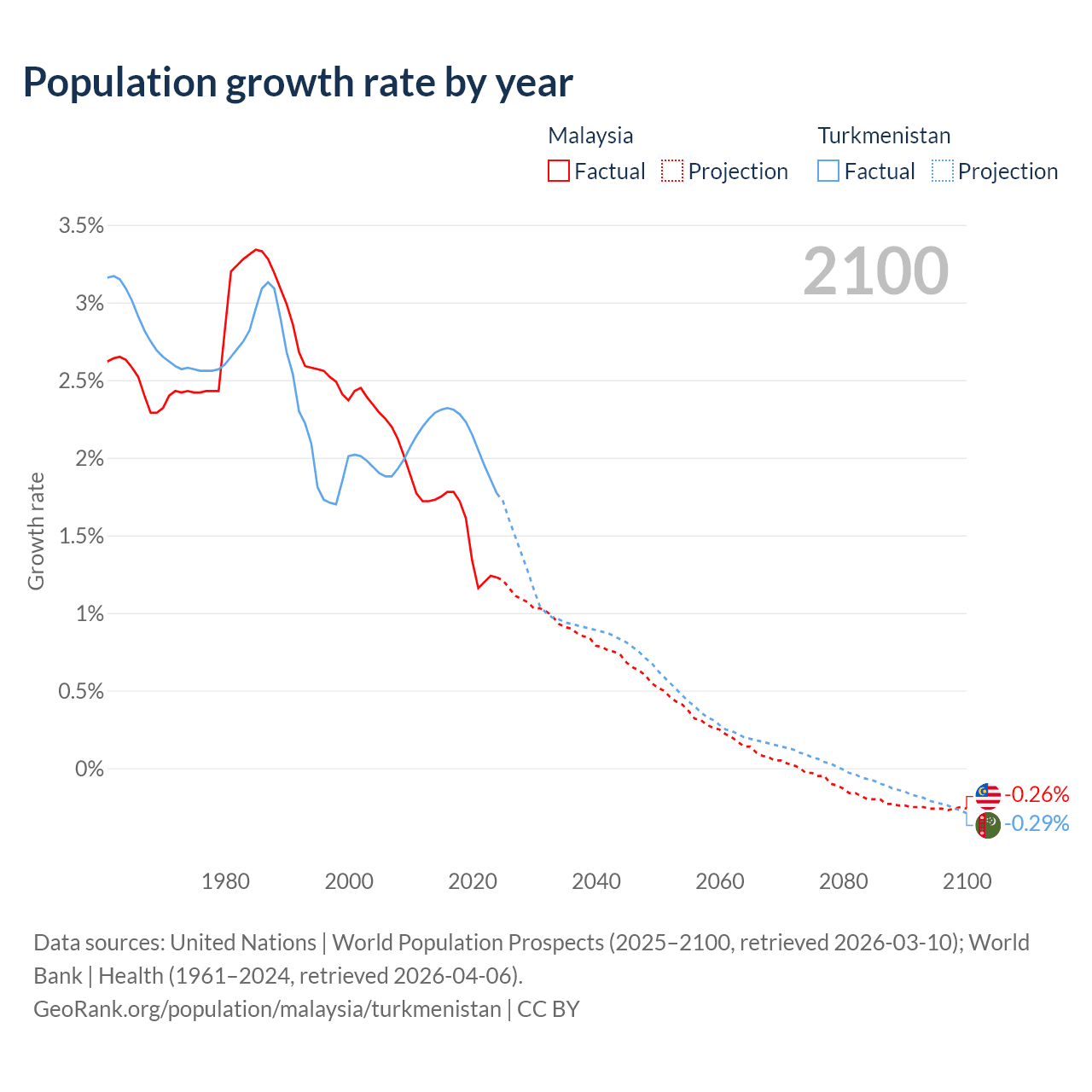 - For the last 10 years, Malaysia has had an average growth rate of +1.5% per year vs +2.14% in Turkmenistan.