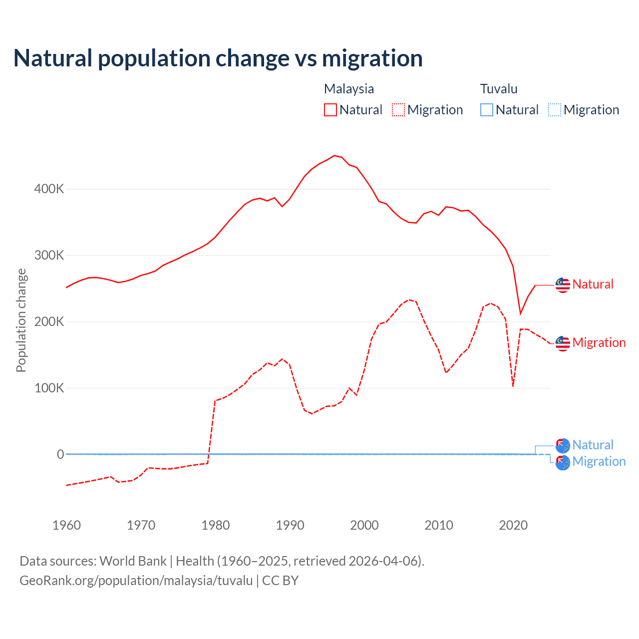 Over the last 10 years, 61.7% of the population change in Malaysia is from natural causes (a gain of 3,029,648 people) and 38.3% is from migration (a gain of 1,882,159 people). In Tuvalu 35.5% is from natural causes (a gain of 1,556 people) and 64.5% is from migration (a loss of 2,827 people).