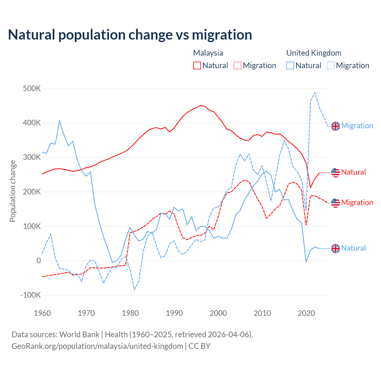Over the last 10 years, 61.7% of the population change in Malaysia is from natural causes (a gain of 3,029,648 people) and 38.3% is from migration (a gain of 1,882,159 people). In the United Kingdom 23.9% is from natural causes (a gain of 1,033,129 people) and 76.1% is from migration (a gain of 3,283,101 people).