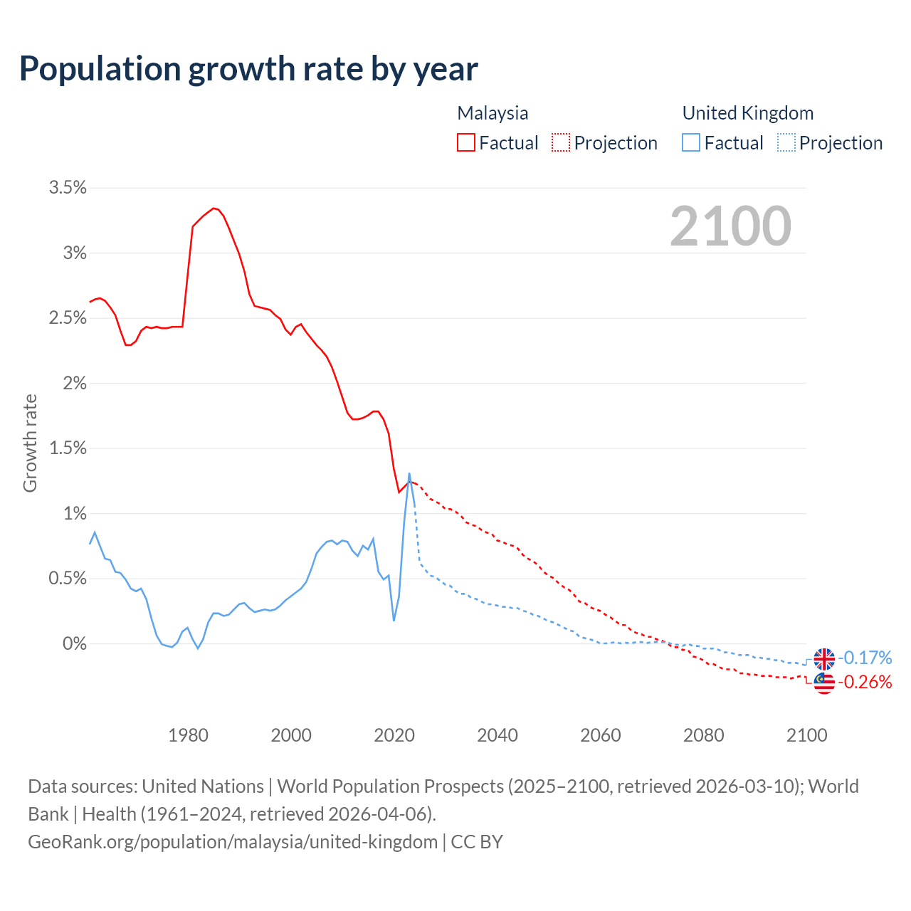 Data sources: World Bank | Health (1960–2024, retrieved 2026-04-06); United Nations | World Population Prospects (1960–2026, retrieved 2026-03-10); U.S. Census Bureau (1960–2025, retrieved 2026-02-08); Central Intelligence Agency (CIA) (2000–2019, retrieved 2026-02-20).