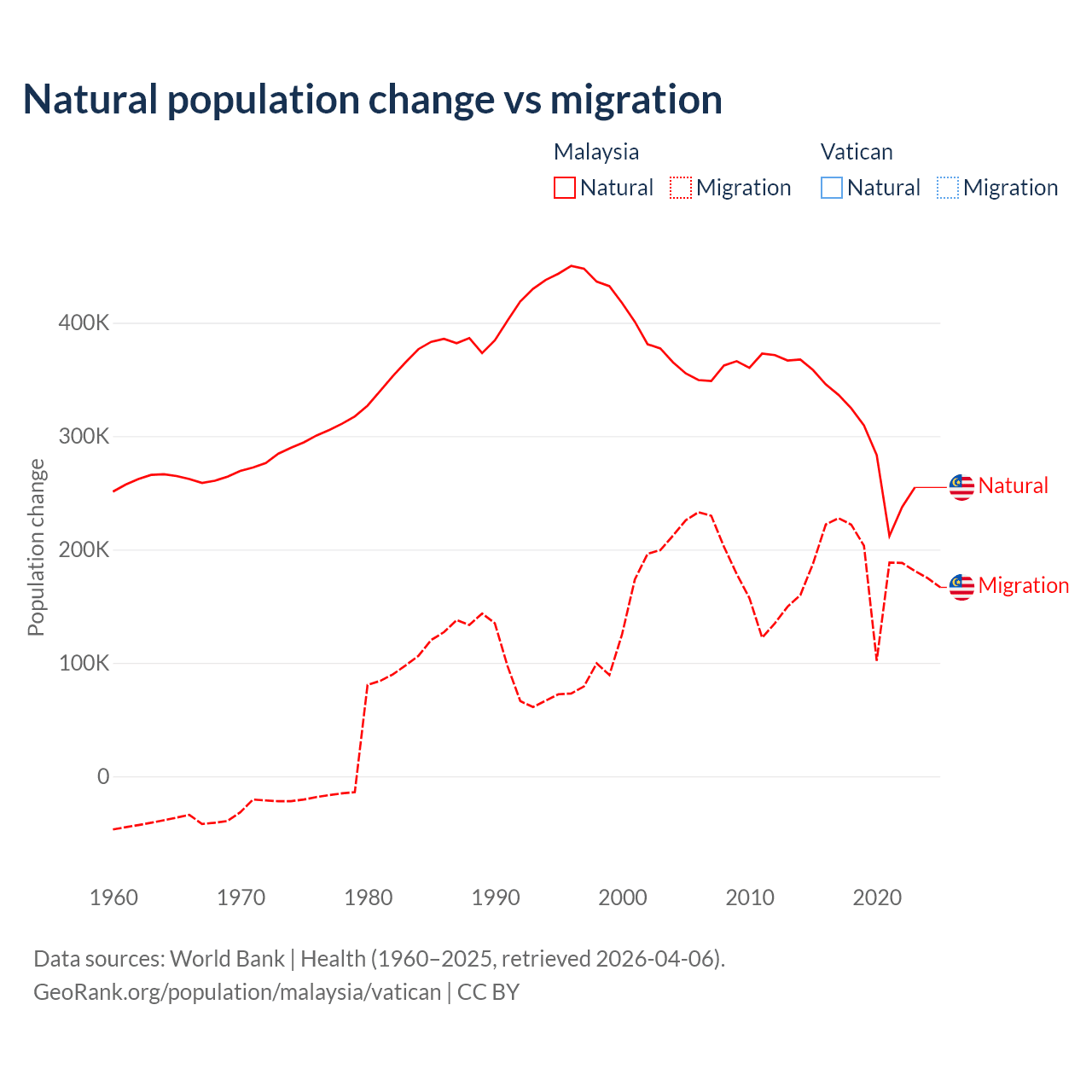- For the last 10 years, Malaysia has had an average growth rate of +1.5% per year vs +1.9% in the Vatican.