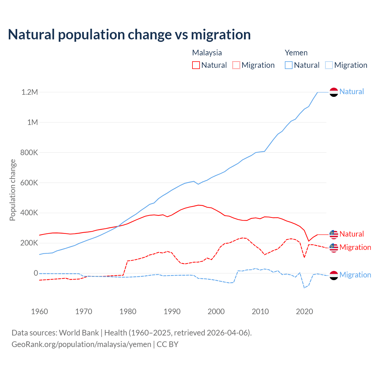 Over the last 10 years, 61.7% of the population change in Malaysia is from natural causes (a gain of 3,029,648 people) and 38.3% is from migration (a gain of 1,882,159 people). In Yemen 97.8% is from natural causes (a gain of 10,460,813 people) and 2.17% is from migration (a loss of 231,814 people).