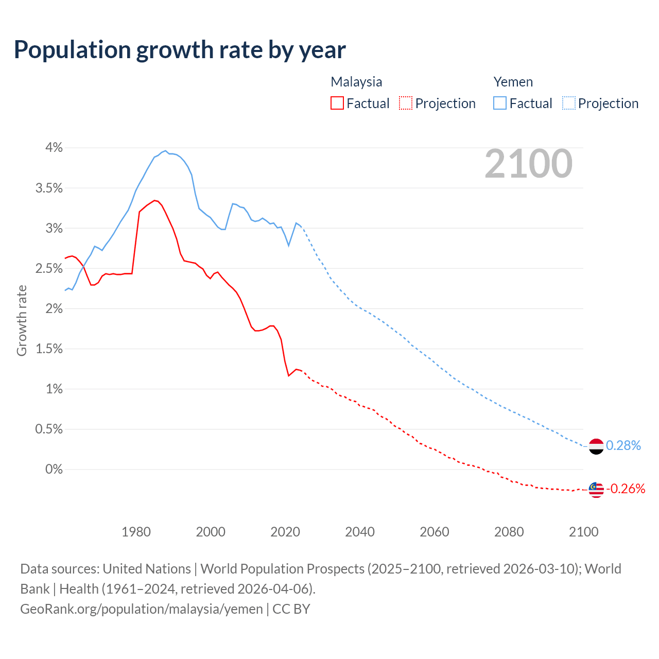 - For the last 10 years, Malaysia has had an average growth rate of +1.5% per year vs +3% in Yemen.