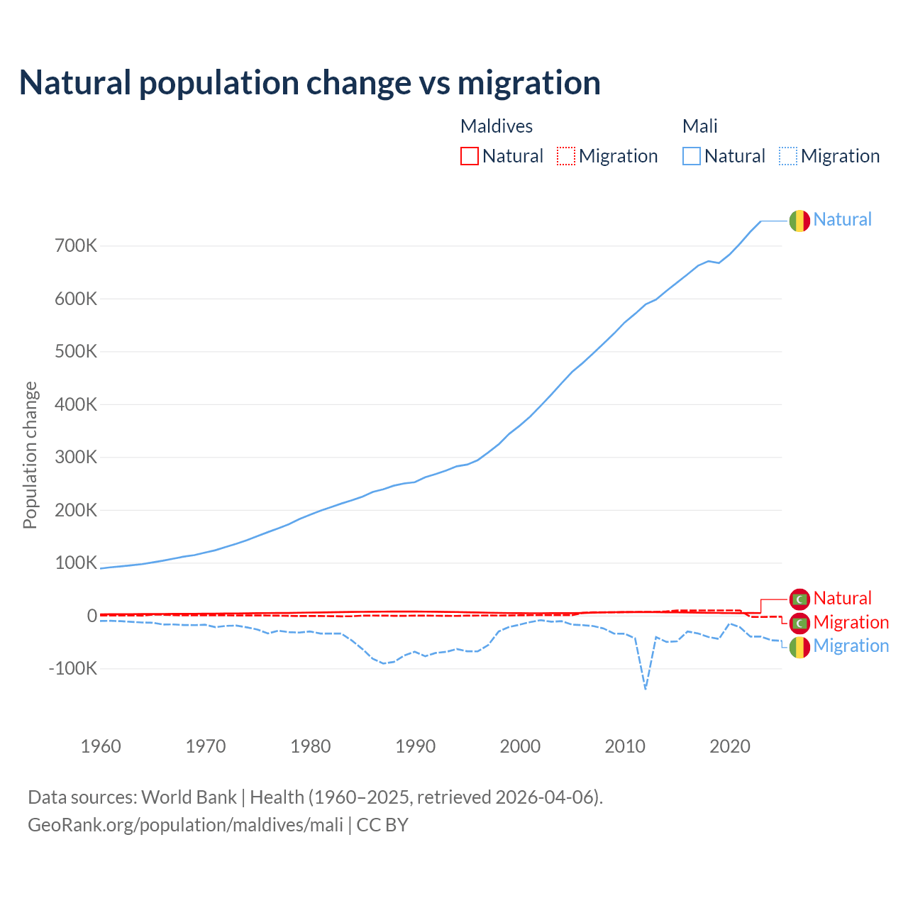 Over the last 10 years, 42.7% of the population change in Maldives is from natural causes (a gain of 51,342 people) and 57.3% is from migration (a gain of 68,788 people). In Mali 94.9% is from natural causes (a gain of 6,749,473 people) and 5.13% is from migration (a loss of 365,292 people).
