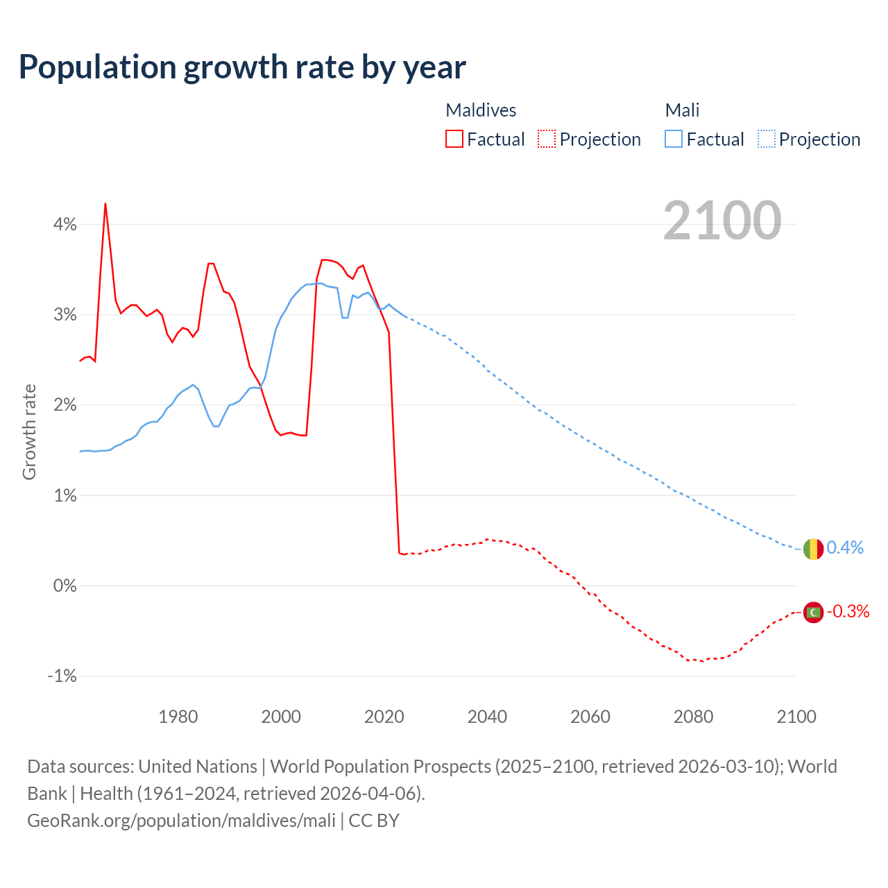- For the last 10 years, Maldives has had an average growth rate of +2.56% per year vs +3.12% in Mali.
