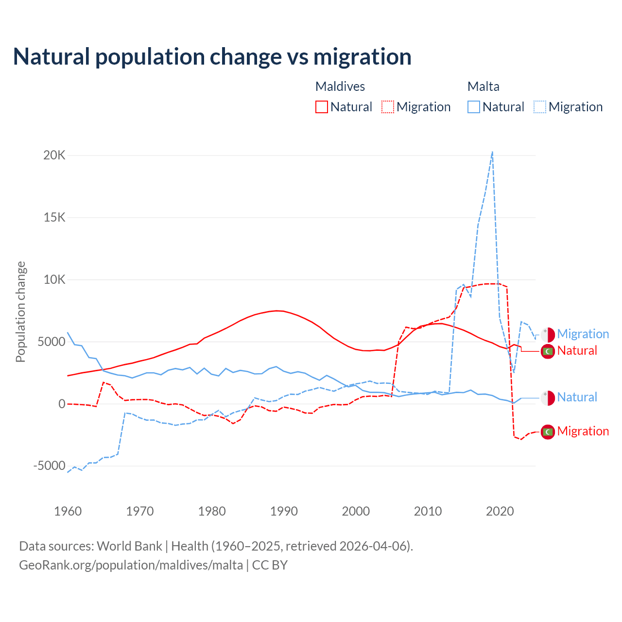 Over the last 10 years, 42.7% of the population change in Maldives is from natural causes (a gain of 51,342 people) and 57.3% is from migration (a gain of 68,788 people). In Malta 5.84% is from natural causes (a gain of 6,181 people) and 94.2% is from migration (a gain of 99,652 people).
