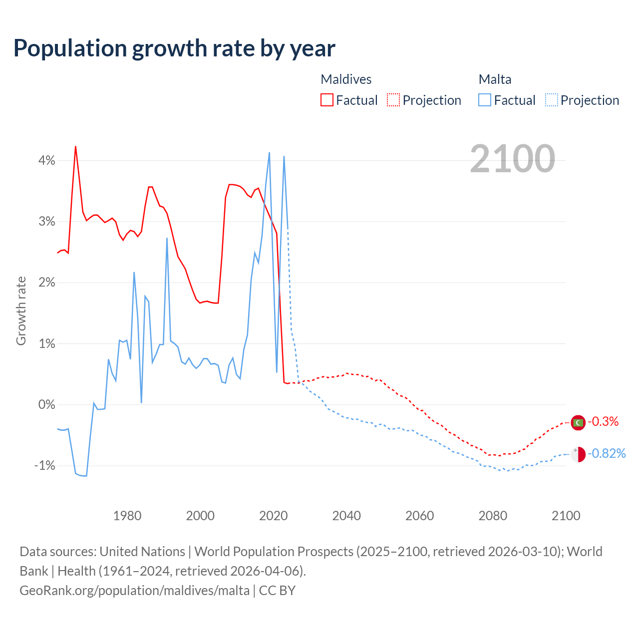 - For the last 10 years, Maldives has had an average growth rate of +2.56% per year vs +2.69% in Malta.