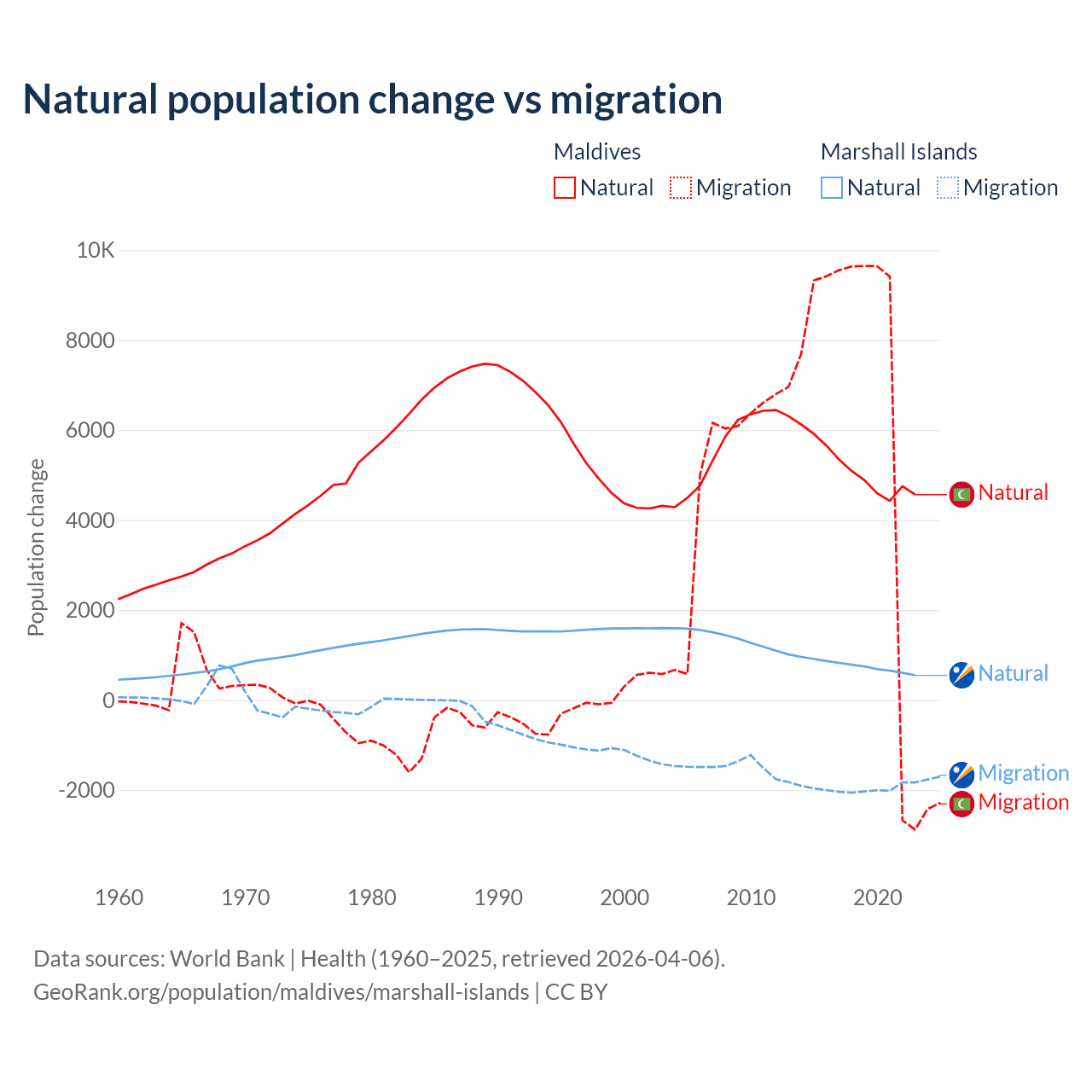Over the last 10 years, 42.7% of the population change in Maldives is from natural causes (a gain of 51,342 people) and 57.3% is from migration (a gain of 68,788 people). In the Marshall Islands 27.8% is from natural causes (a gain of 7,592 people) and 72.2% is from migration (a loss of 19,682 people).