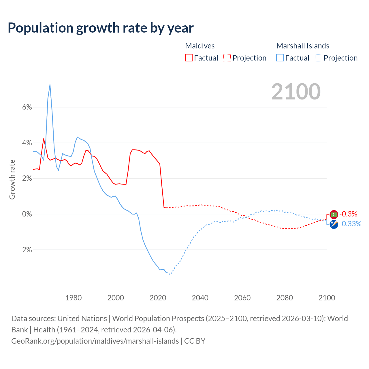 - For the last 10 years, Maldives has had an average growth rate of +2.56% per year vs -2.69% in the Marshall Islands.
