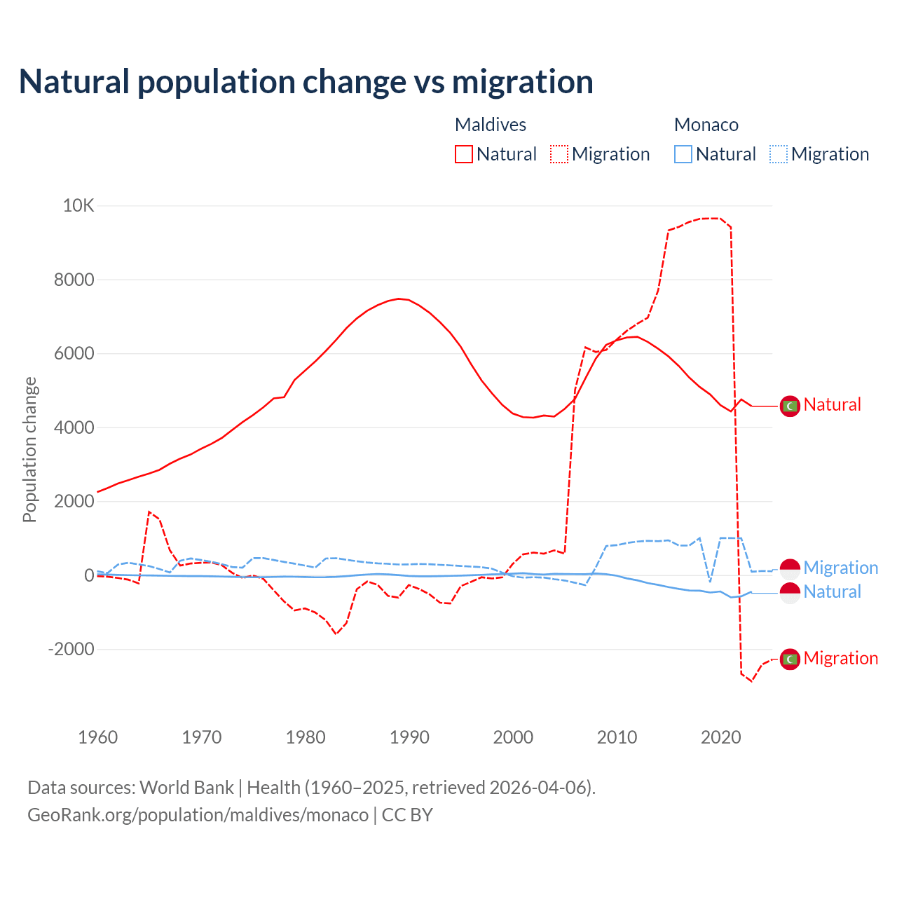 Over the last 10 years, 42.7% of the population change in Maldives is from natural causes (a gain of 51,342 people) and 57.3% is from migration (a gain of 68,788 people). In Monaco 37.3% is from natural causes (a loss of 4,357 people) and 62.7% is from migration (a gain of 7,333 people).