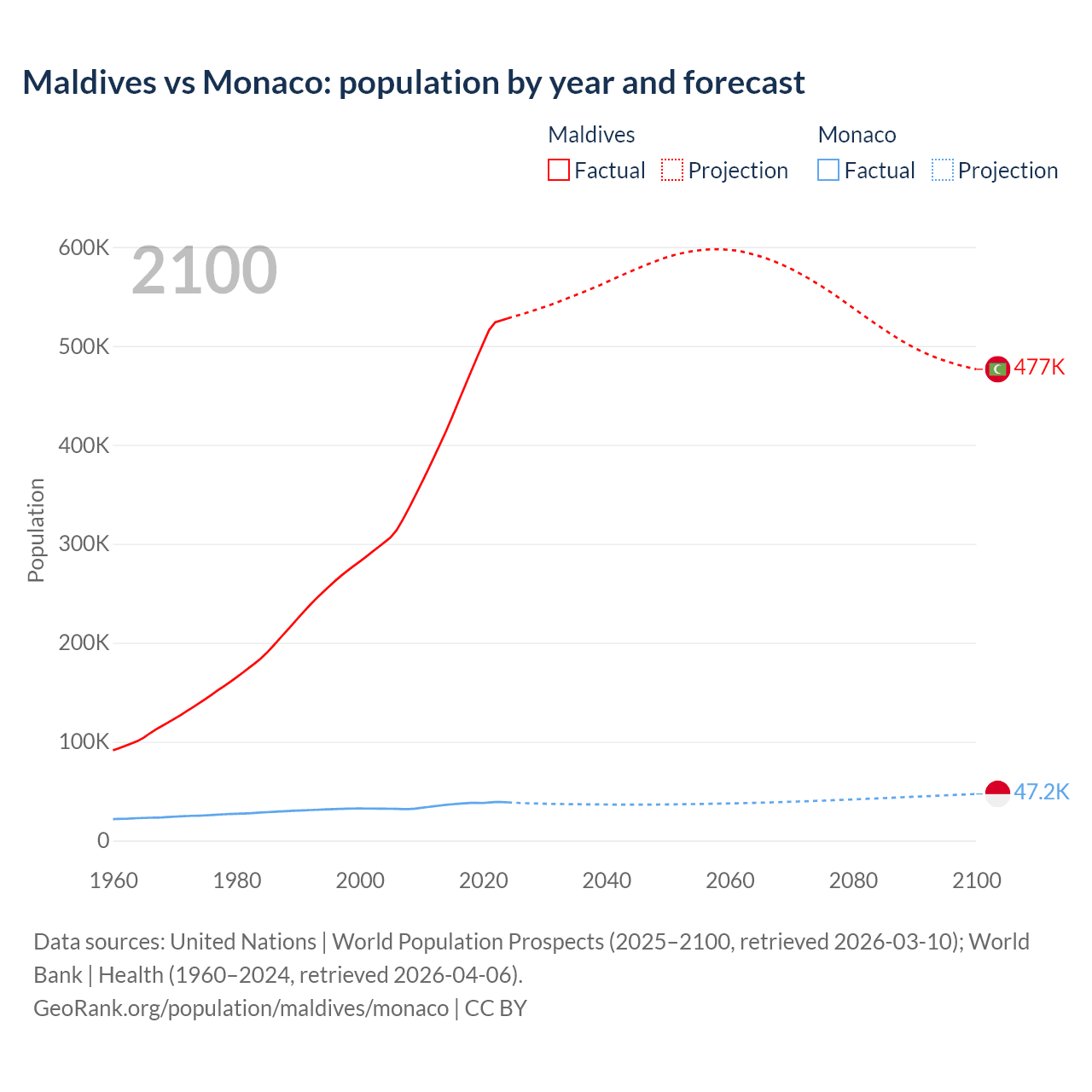 The latest officially reported population of Maldives was 527,799 in 2024 vs 38,631 people in Monaco in 2024. In 2026, based on the adjusted UN estimation, the current Maldives' population is 532,057 people compared to 38,053 in Monaco.