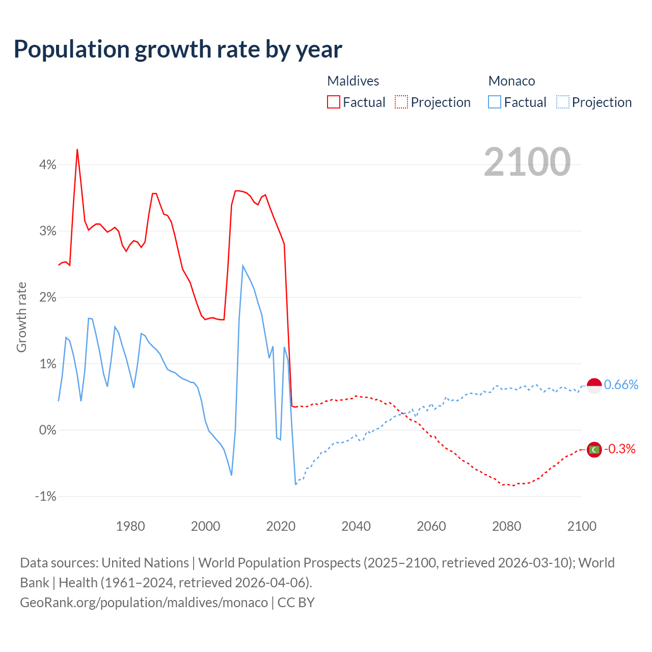 - For the last 10 years, Maldives has had an average growth rate of +2.56% per year vs +0.79% in Monaco.
