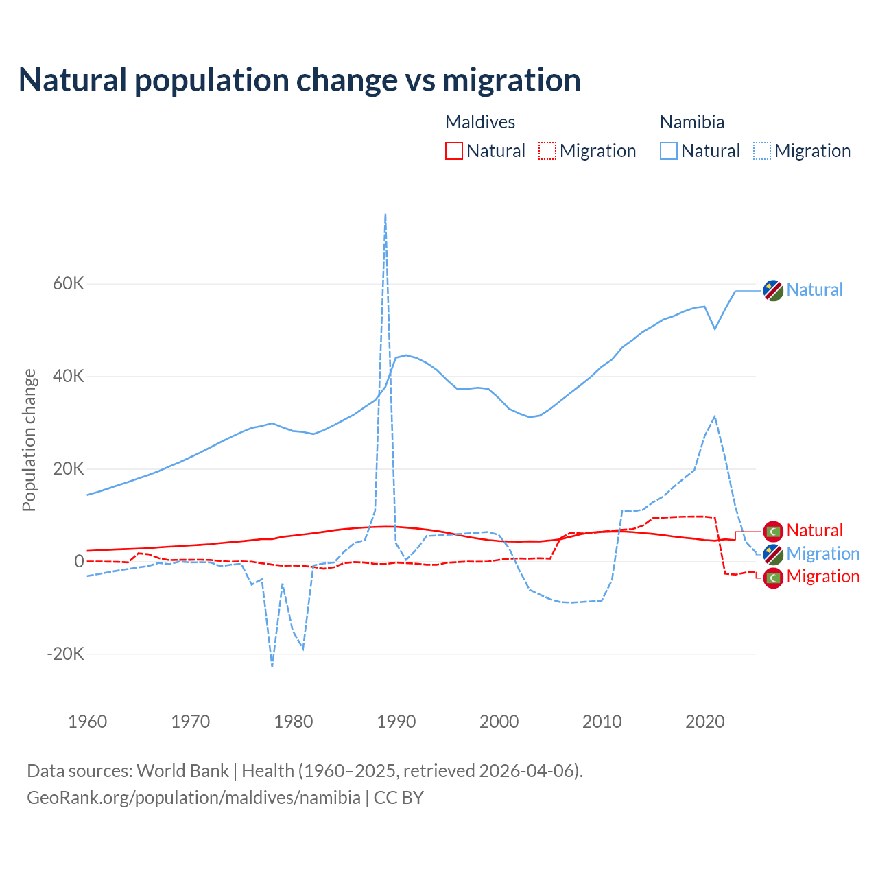 Over the last 10 years, 42.7% of the population change in Maldives is from natural causes (a gain of 51,342 people) and 57.3% is from migration (a gain of 68,788 people). In Namibia 74.3% is from natural causes (a gain of 532,532 people) and 25.7% is from migration (a gain of 183,837 people).