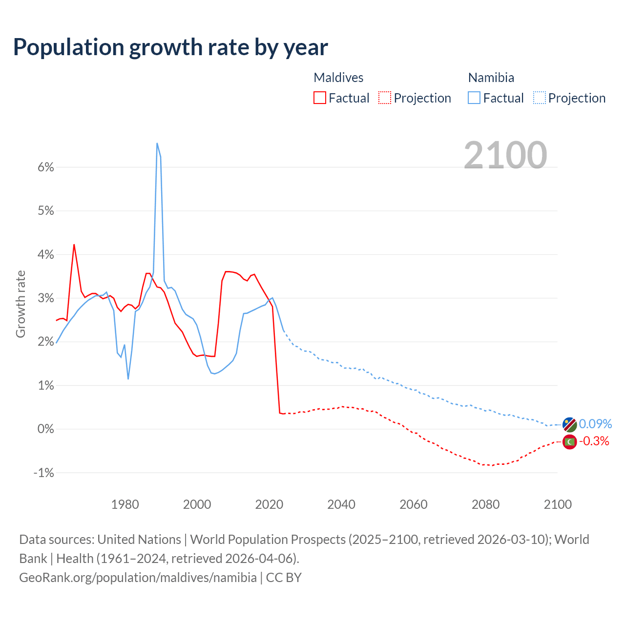 - For the last 10 years, Maldives has had an average growth rate of +2.56% per year vs +2.73% in Namibia.