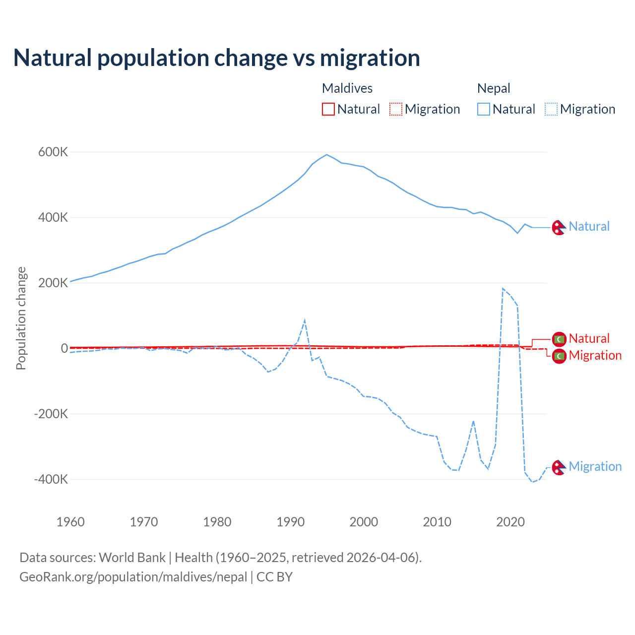 Over the last 10 years, 42.7% of the population change in Maldives is from natural causes (a gain of 51,342 people) and 57.3% is from migration (a gain of 68,788 people). In Nepal 67.9% is from natural causes (a gain of 3,909,749 people) and 32.1% is from migration (a loss of 1,851,664 people).