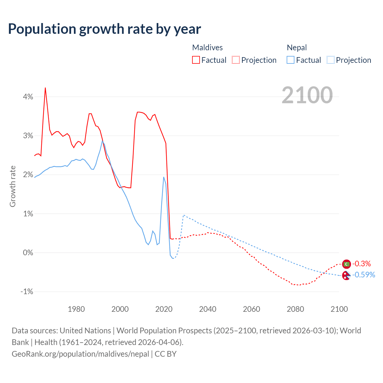 - For the last 10 years, Maldives has had an average growth rate of +2.56% per year vs +0.66% in Nepal.