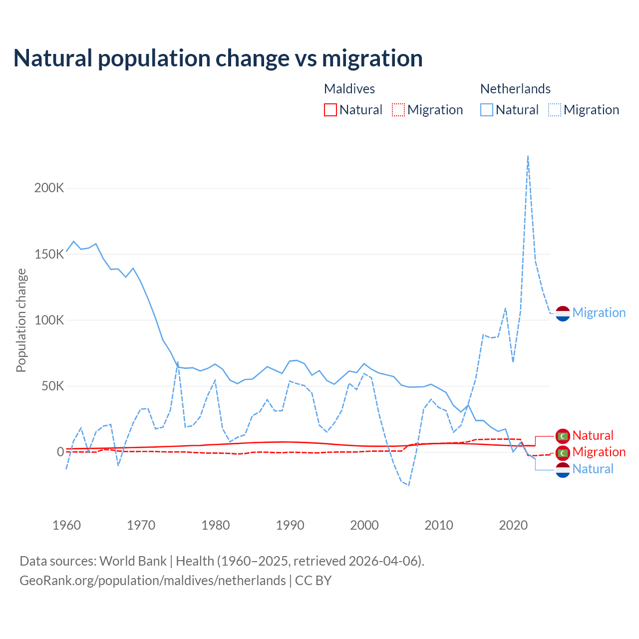 Over the last 10 years, 42.7% of the population change in Maldives is from natural causes (a gain of 51,342 people) and 57.3% is from migration (a gain of 68,788 people). In the Netherlands 11.8% is from natural causes (a gain of 134,554 people) and 88.2% is from migration (a gain of 1,006,495 people).