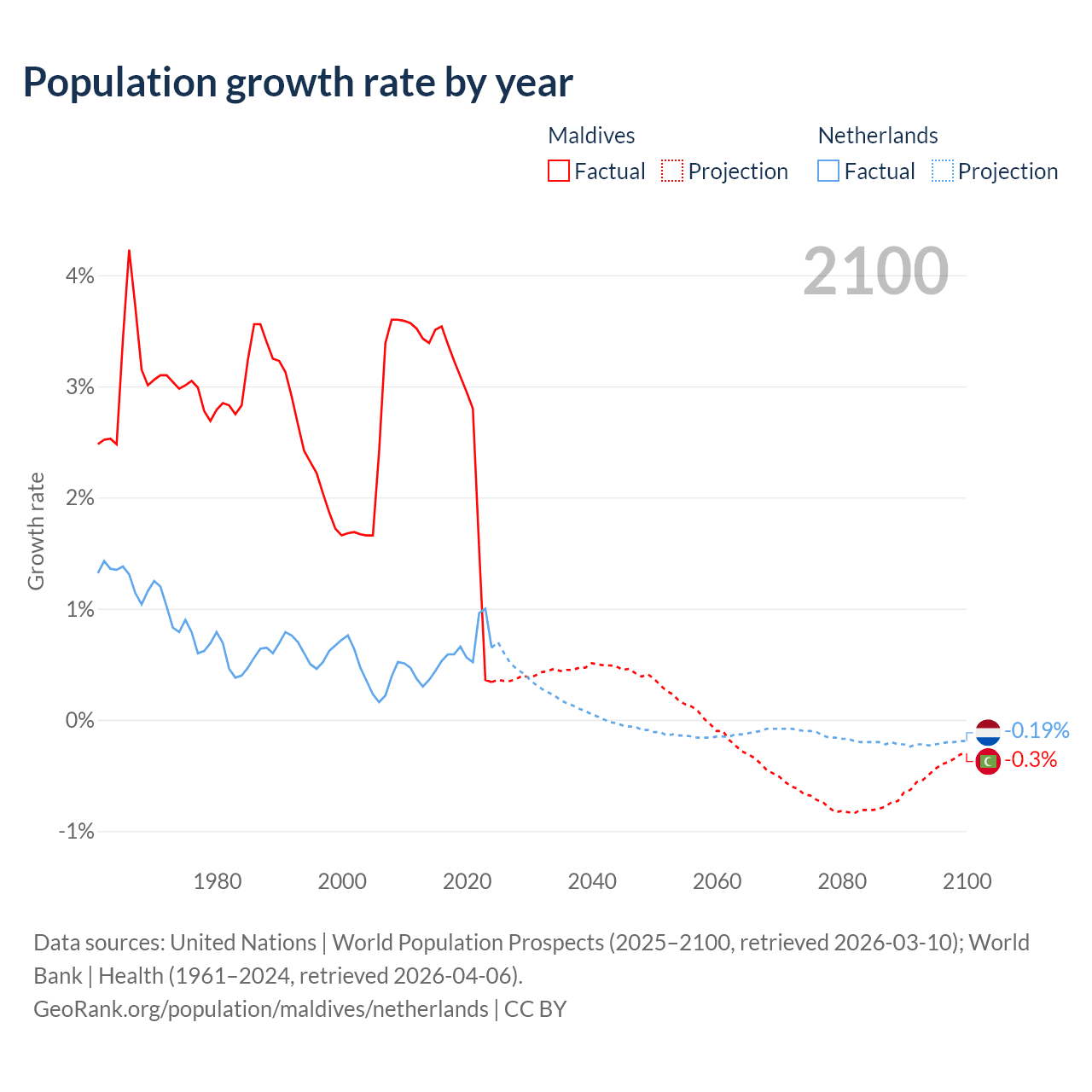 - For the last 10 years, Maldives has had an average growth rate of +2.56% per year vs +0.62% in the Netherlands.