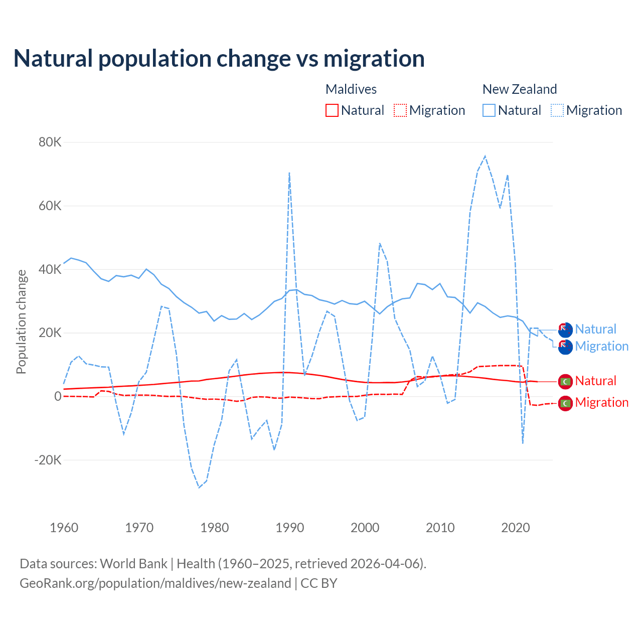 Over the last 10 years, 42.7% of the population change in Maldives is from natural causes (a gain of 51,342 people) and 57.3% is from migration (a gain of 68,788 people). In New Zealand 34.4% is from natural causes (a gain of 247,767 people) and 65.6% is from migration (a gain of 471,602 people).