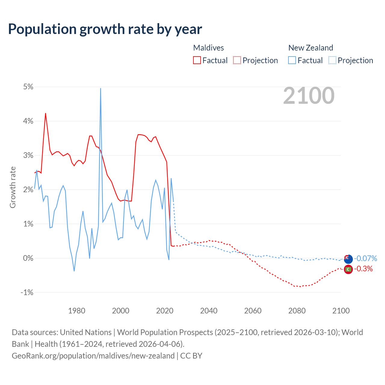 - For the last 10 years, Maldives has had an average growth rate of +2.56% per year vs +1.6% in New Zealand.