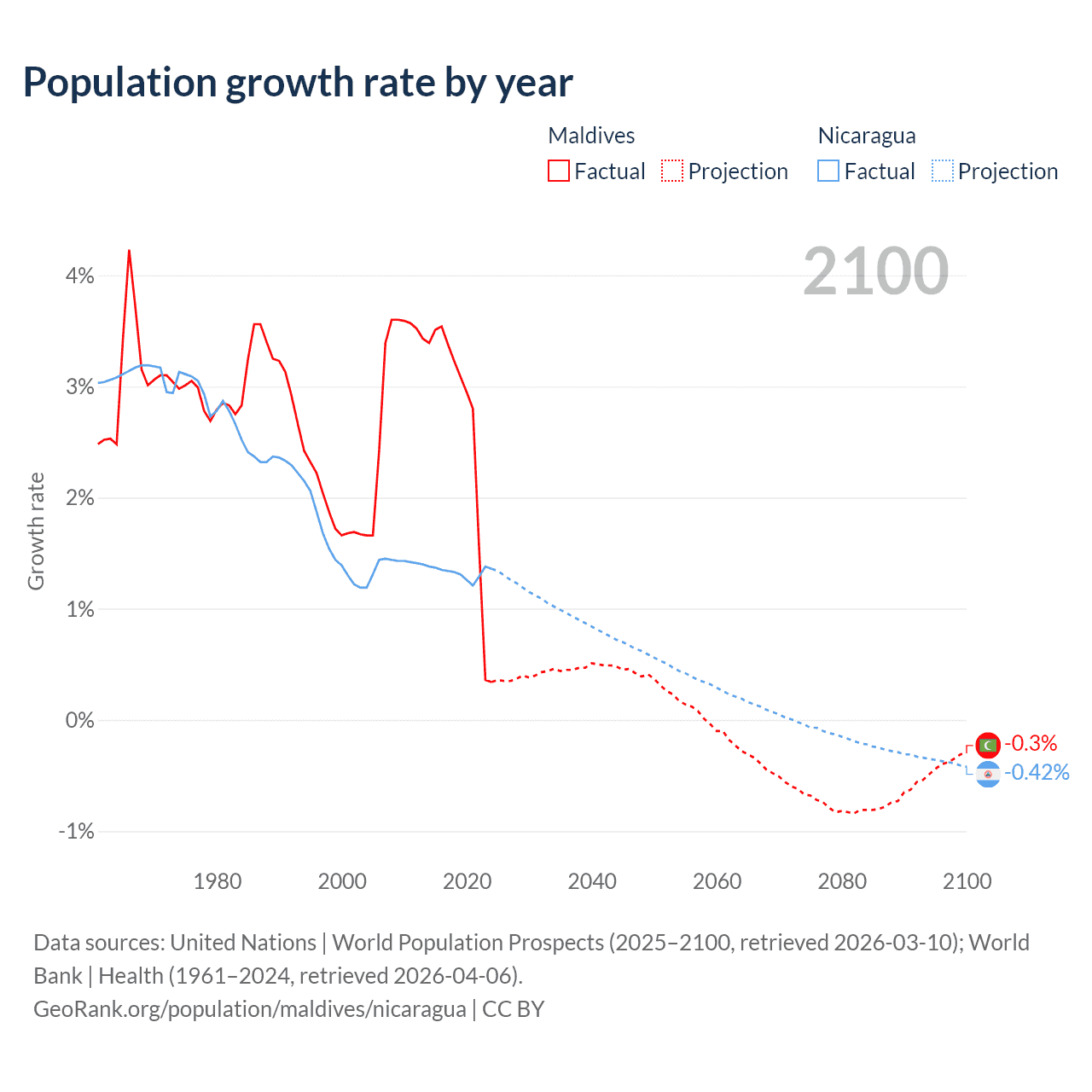 - For the last 10 years, Maldives has had an average growth rate of +2.56% per year vs +1.33% in Nicaragua.