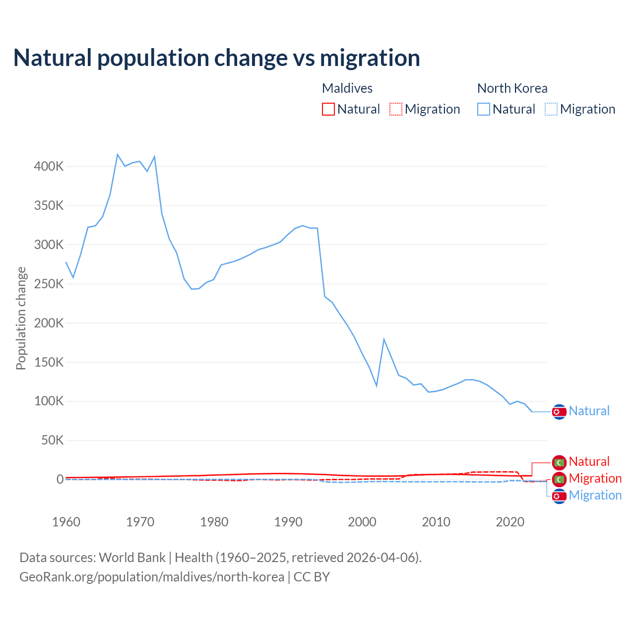Over the last 10 years, 42.7% of the population change in Maldives is from natural causes (a gain of 51,342 people) and 57.3% is from migration (a gain of 68,788 people). In North Korea 97.7% is from natural causes (a gain of 1,097,372 people) and 2.33% is from migration (a loss of 26,227 people).