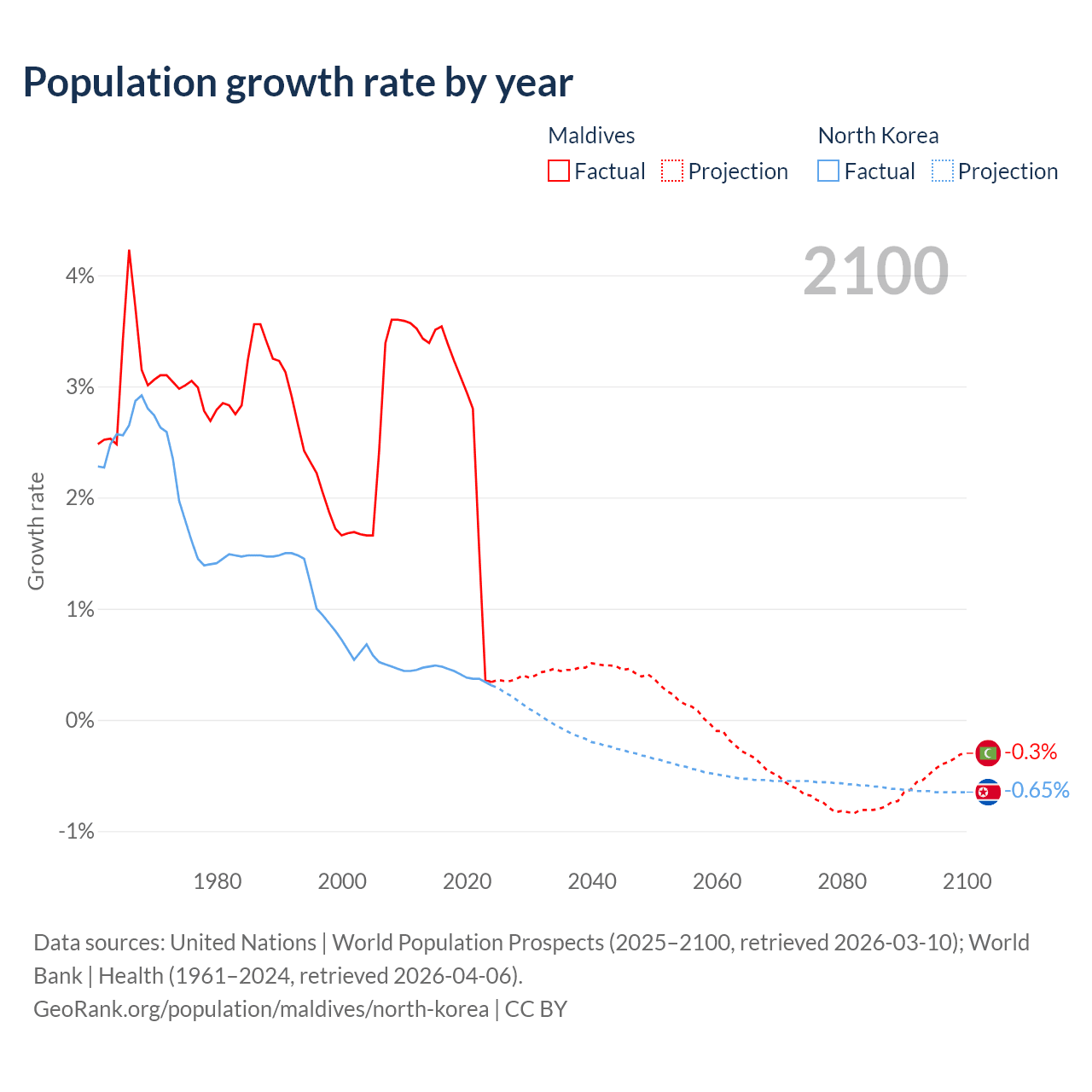 - For the last 10 years, Maldives has had an average growth rate of +2.56% per year vs +0.41% in North Korea.