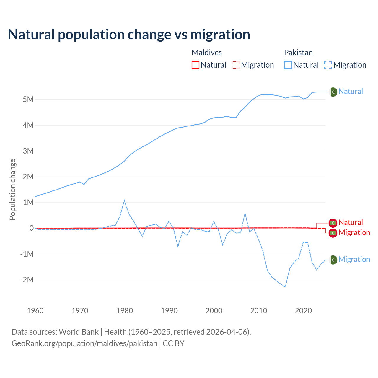 Over the last 10 years, 42.7% of the population change in Maldives is from natural causes (a gain of 51,342 people) and 57.3% is from migration (a gain of 68,788 people). In Pakistan 77.8% is from natural causes (a gain of 51,255,404 people) and 22.2% is from migration (a loss of 14,629,055 people).