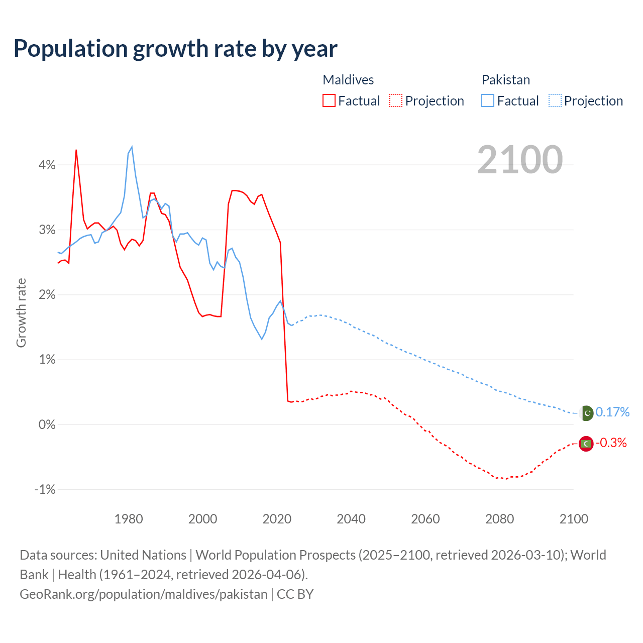 - For the last 10 years, Maldives has had an average growth rate of +2.56% per year vs +1.6% in Pakistan.