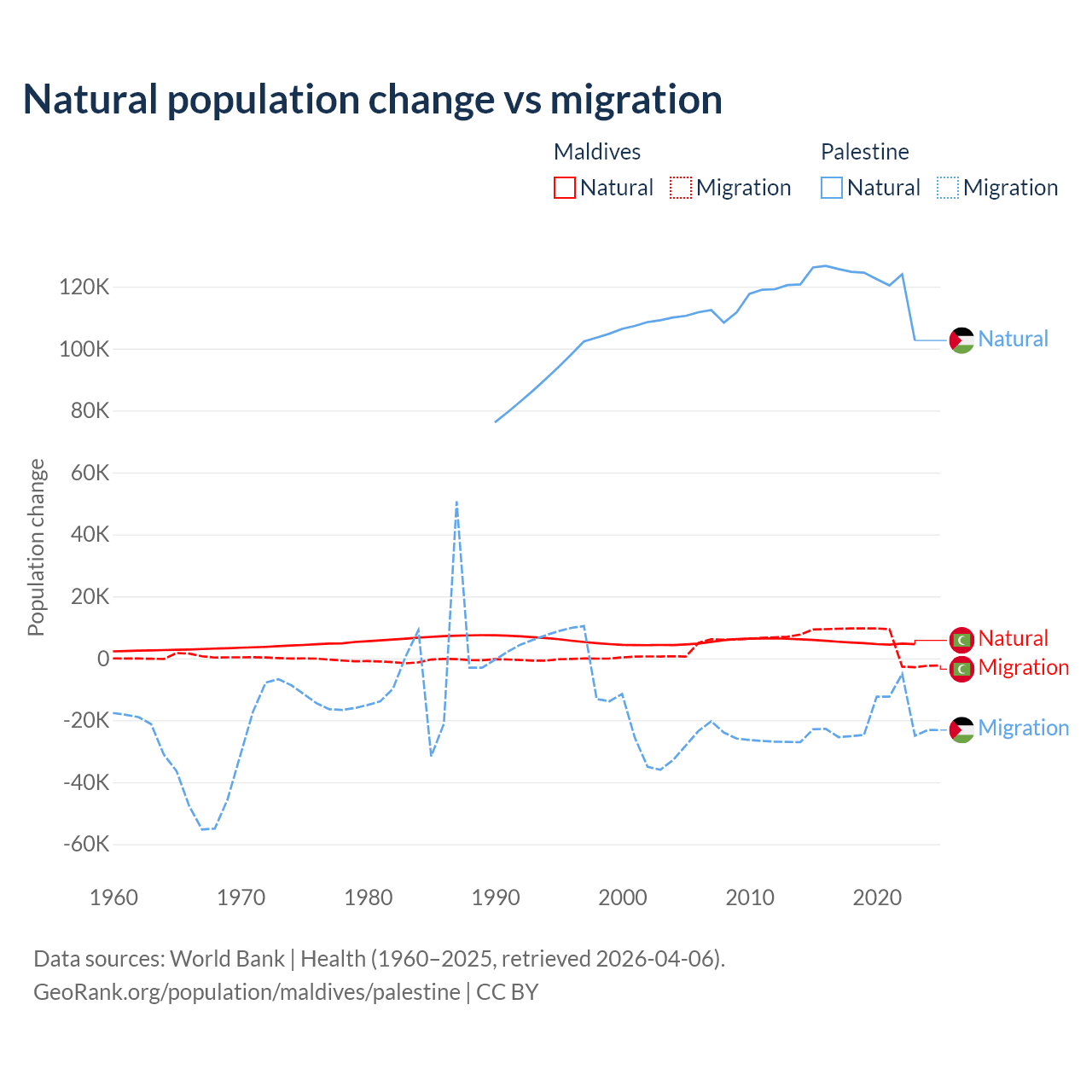 Data sources: World Bank | Health (1960–2024, retrieved 2026-04-06); United Nations | World Population Prospects (1960–2026, retrieved 2026-03-10); U.S. Census Bureau (1960–2025, retrieved 2026-02-08); Central Intelligence Agency (CIA) (2000–2019, retrieved 2026-02-20).