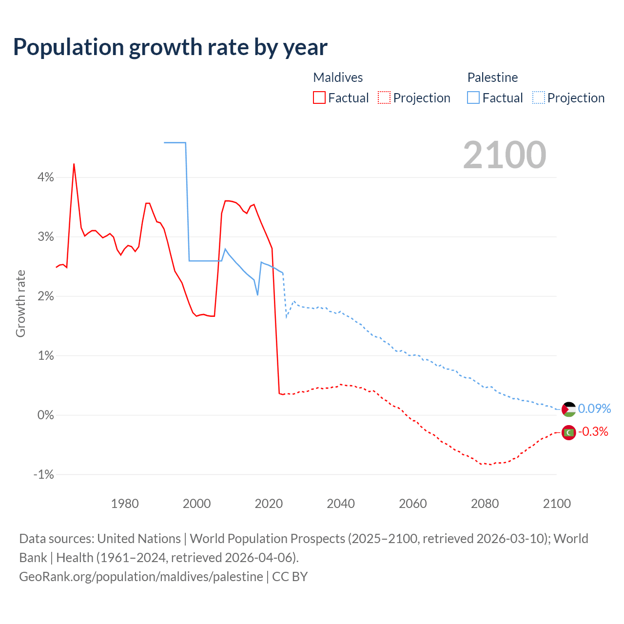 - For the last 10 years, Maldives has had an average growth rate of +2.56% per year vs +2.4% in Palestine.